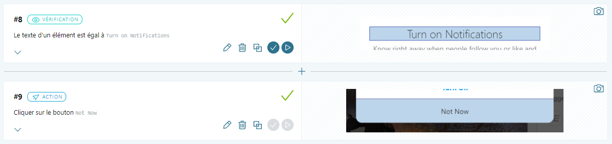Même si chaque Action intègre des contrôles de base (pour cliquer sur un élément, il est nécessaire et logique qu’il soit présent et cliquable par exemple), les Étapes de test de type Vérification apporteront une sécurité supplémentaire et augmenteront la qualité du Scénario de test.