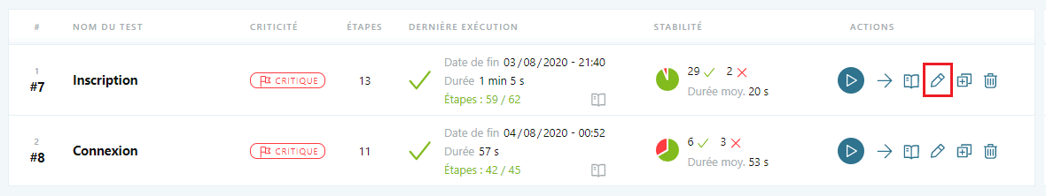 - Depuis la page de liste des Tests ou Blocs d'étapes, cliquer sur l'icône de modification du scénario :