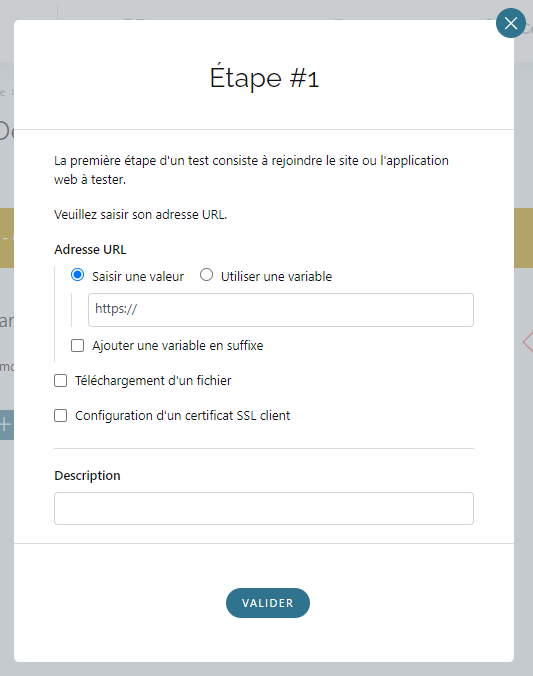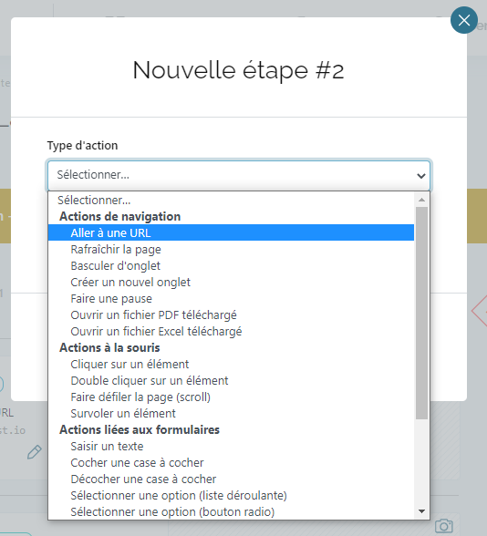 - S'il s'agit de la première étape du scénario d'un Test, alors seule l'Action Aller à l'URL est possible :