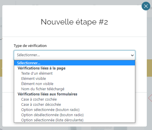 - Le formulaire de création d'une Étape de test de type Vérification s'affiche :