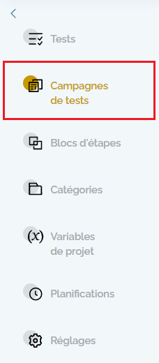 - Cliquer sur la rubrique Campagnes de tests du Menu Projet dans le panneau latéral