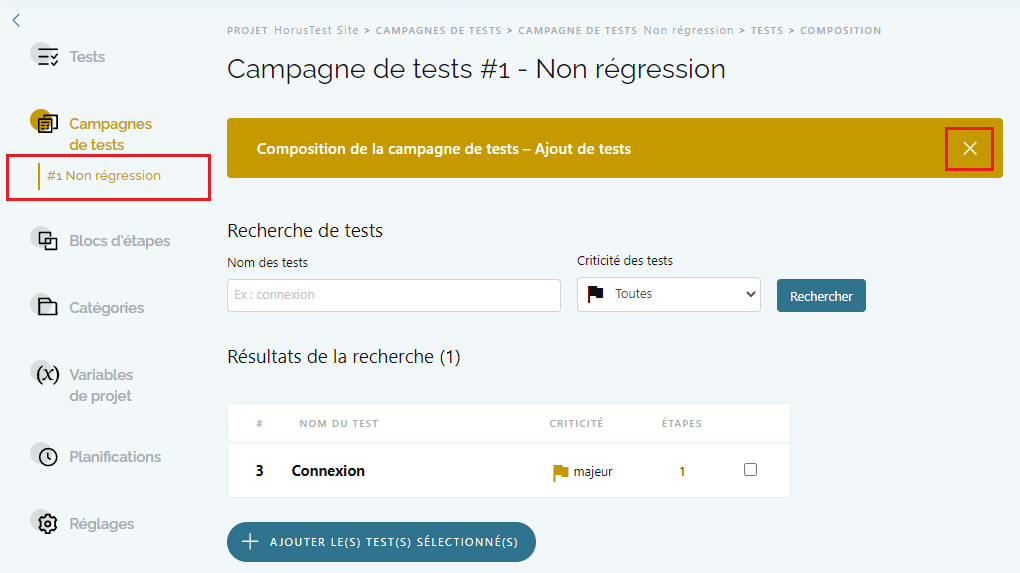 - Cliquer sur l'icône de fermeture de la page d'édition de la composition de la Campagne de tests