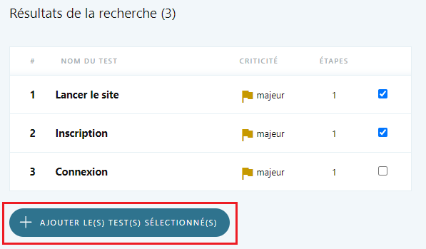 - Cliquer sur le bouton Ajouter le(s) Test(s) sélectionné(s) pour finaliser l'opération