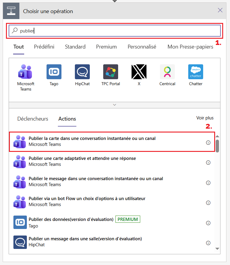 - Saisir le mot publier dans le champ de recherche parmi les actions et les connecteurs puis sélectionner l'action Publier la carte dans une conversation instantanée ou un canal