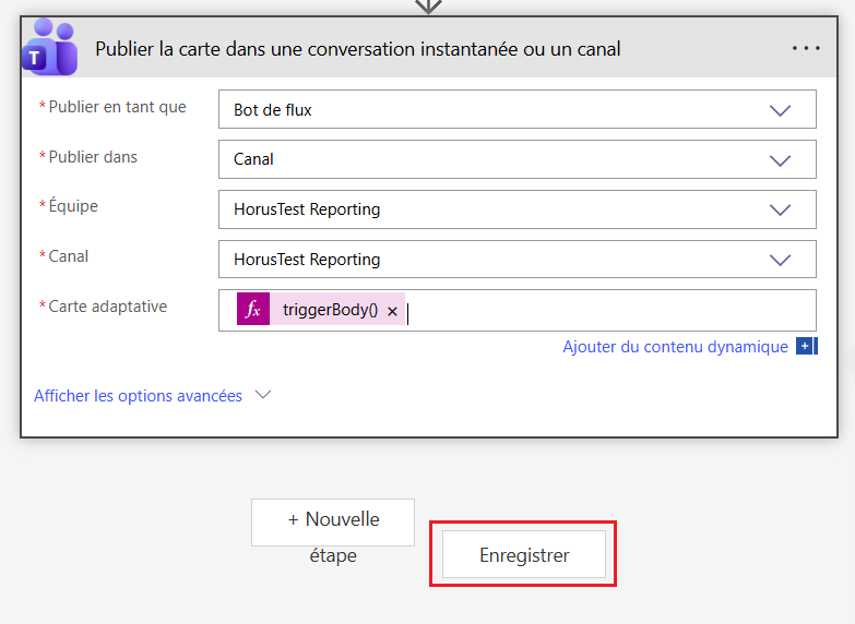 - Cliquer sur le bouton Enregistrer pour finaliser la configuration de l'étape