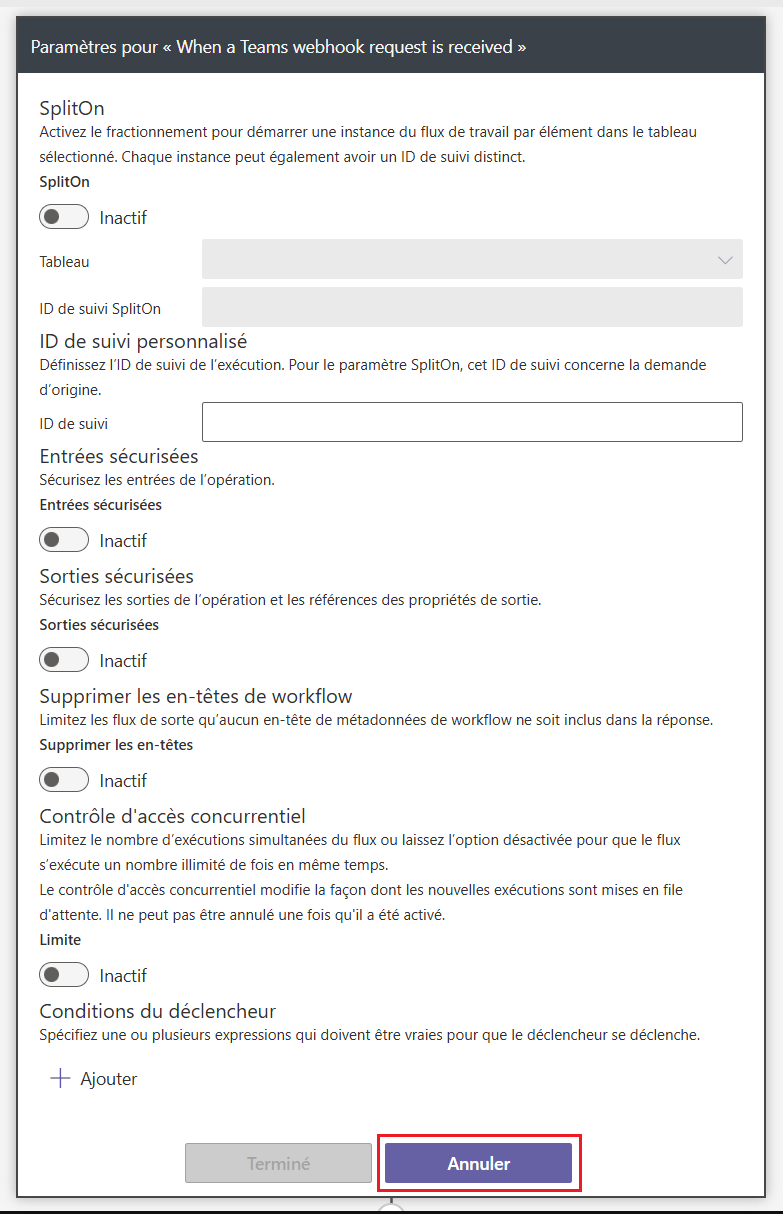 - Cliquer sur le bouton Menu pour When a Teams webhook request is received