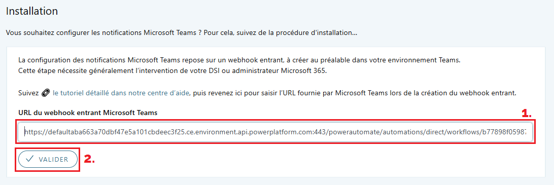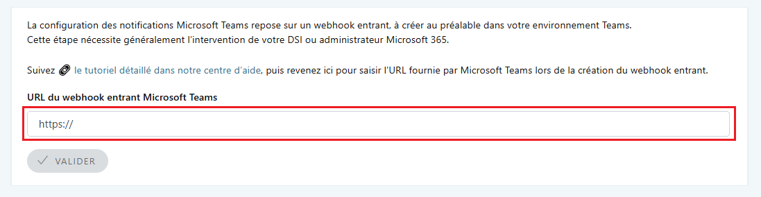 - Le formulaire de saisie de l'URL du webhook entrant Microsoft Teams apparaît :