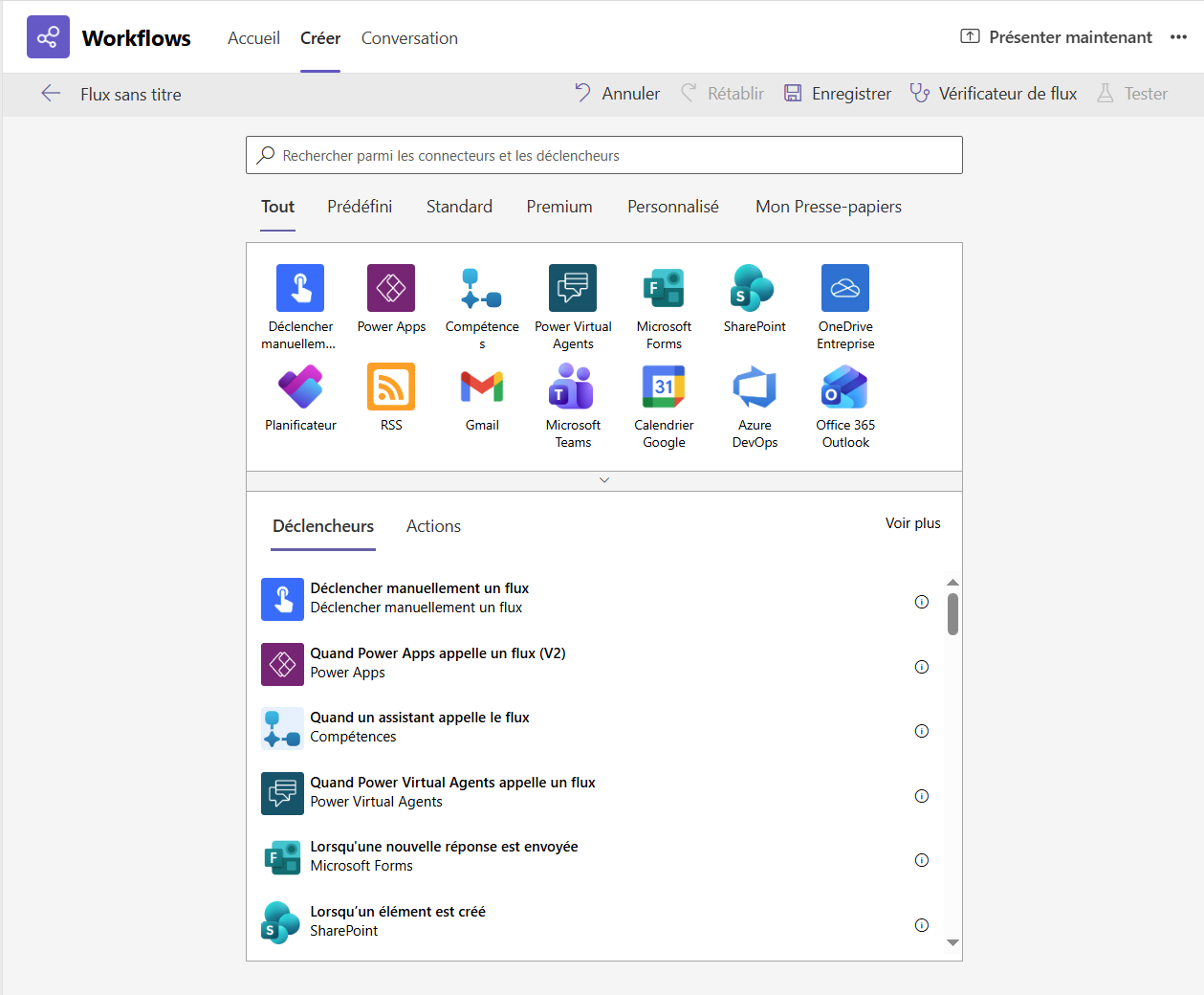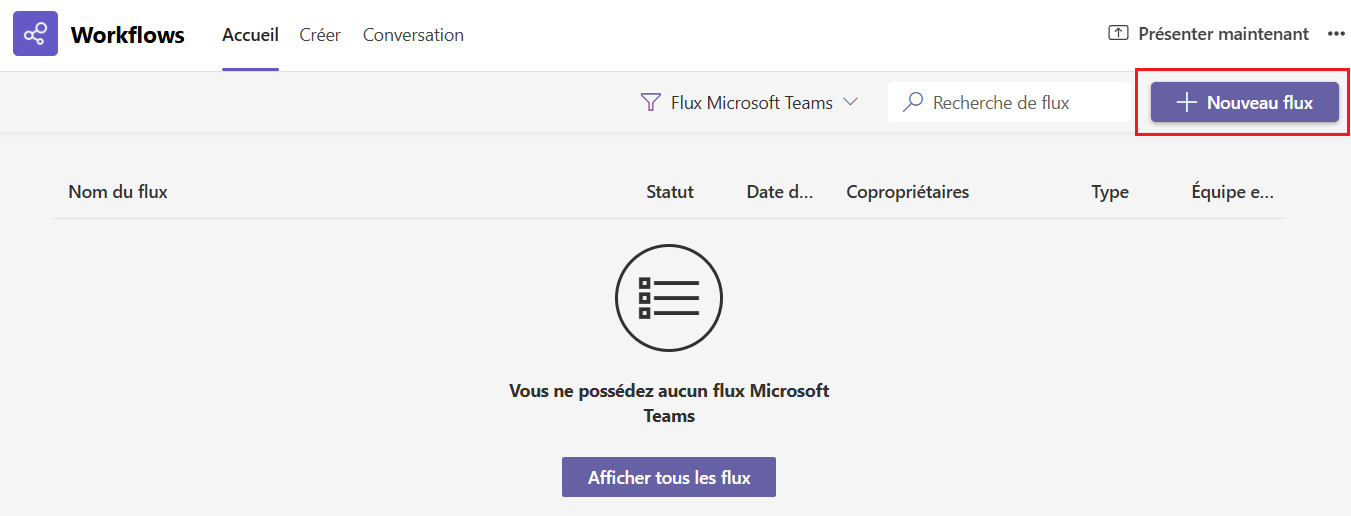 - La liste des Flux de travail existants apparaît. Cliquer sur le bouton Nouveau flux ou sur l'onglet Créer