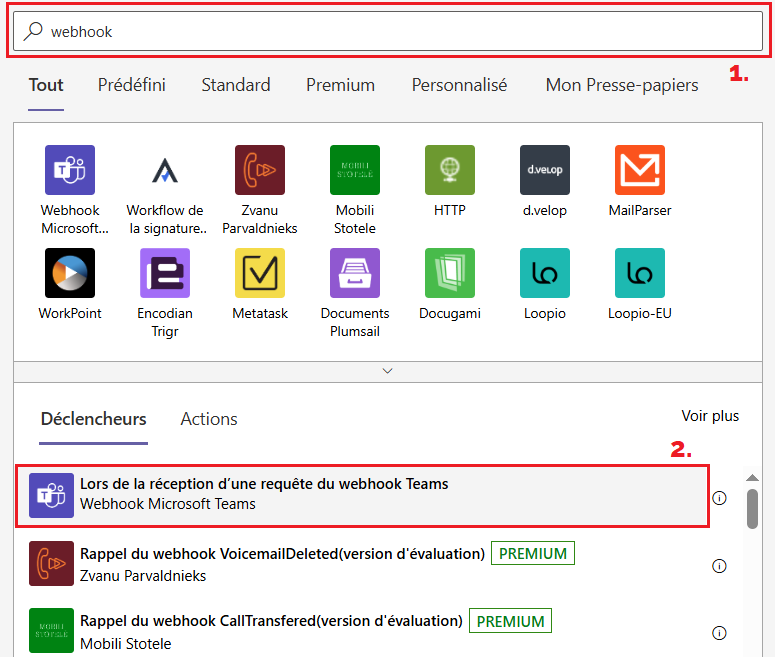 - Saisir le mot webhook dans le champ de recherche parmi les connecteurs et les déclencheurs puis sélectionner le déclencheur Lors de la réception d'une requête du webhook Teams