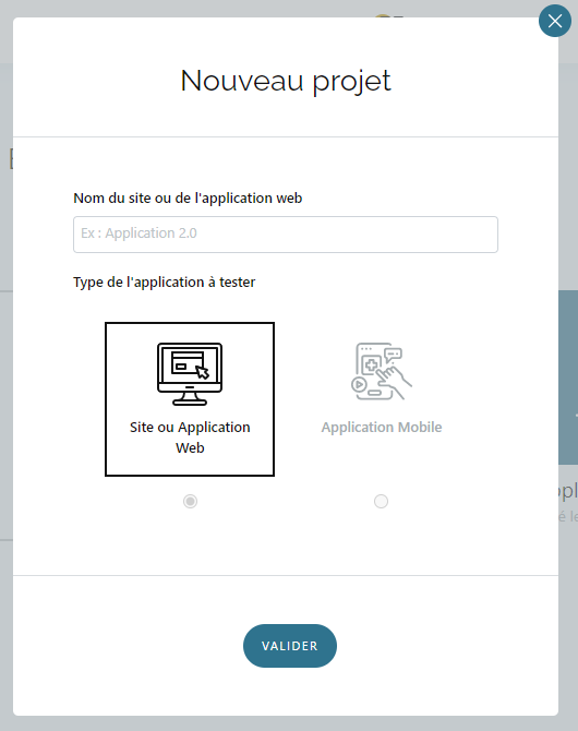- Saisir le nom du Projet et sélectionner le type de l'application à tester (Web ou Mobile native)