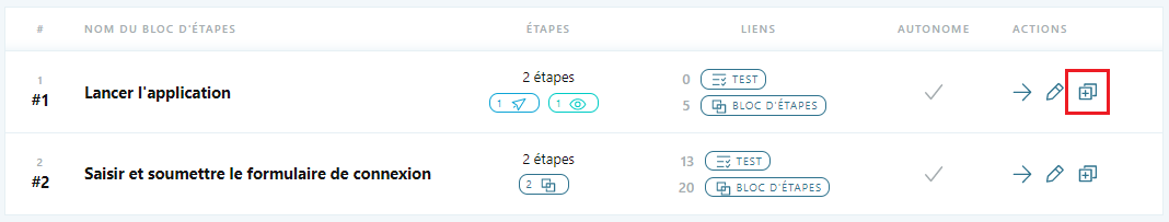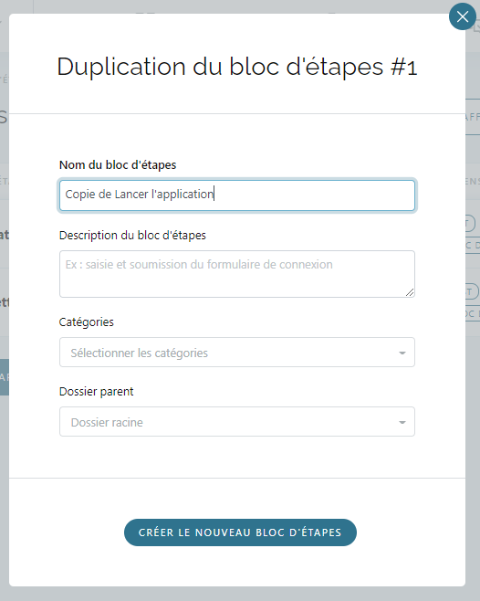 Dupliquer un Bloc d'étapes a pour objectif de copier l'intégralité d'un Bloc d'étapes dans un nouveau Bloc d'étapes, ce qui comprend :