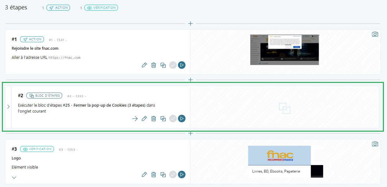 Le nouveau Bloc d'étapes est alors créé dans la liste des Blocs d'étapes et il vient remplacer automatiquement, dans le Scénario de test, la séquence d'étapes qui le compose :
