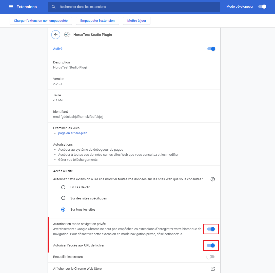 - Activer les 2 options requises Autoriser en mode navigation privée et Autoriser l’accès aux URL de fichier