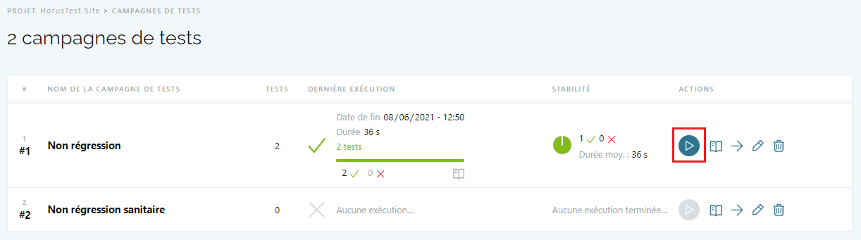- Depuis la liste des Campagnes de tests