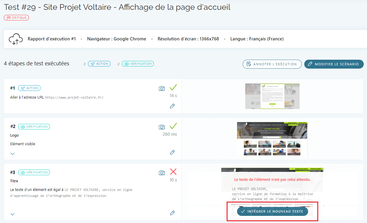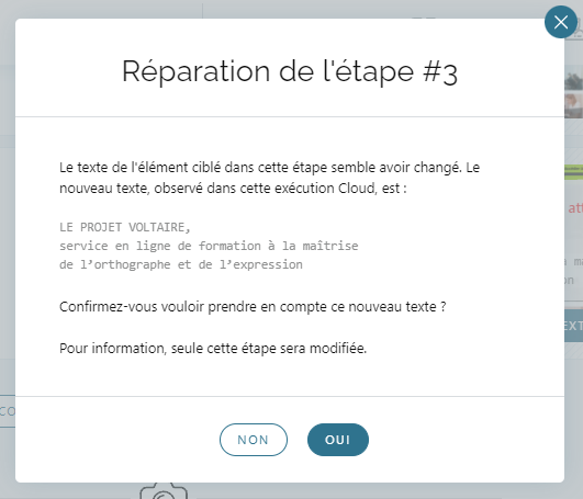 Lorsqu'une Exécution Cloud échoue parce que le texte de l'élément ciblé dans l'étape en échec a changé, HorusTest offre la possibilité de prendre en compte le nouveau texte en 1 clic.