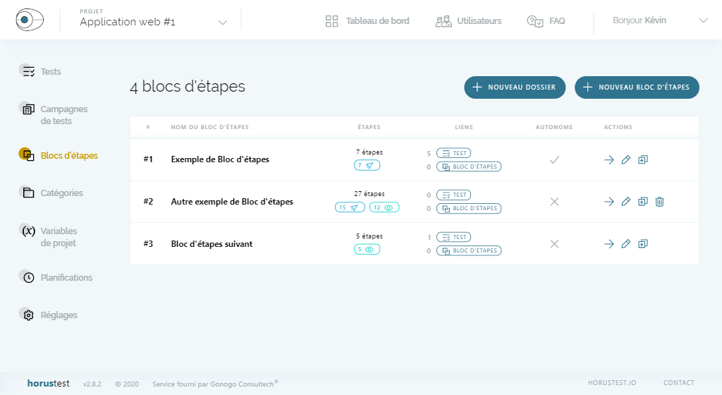 Pour réduire drastiquement les coût de maintenance des Scénarios de tests, HorusTest a mis en place les Blocs d’étapes.