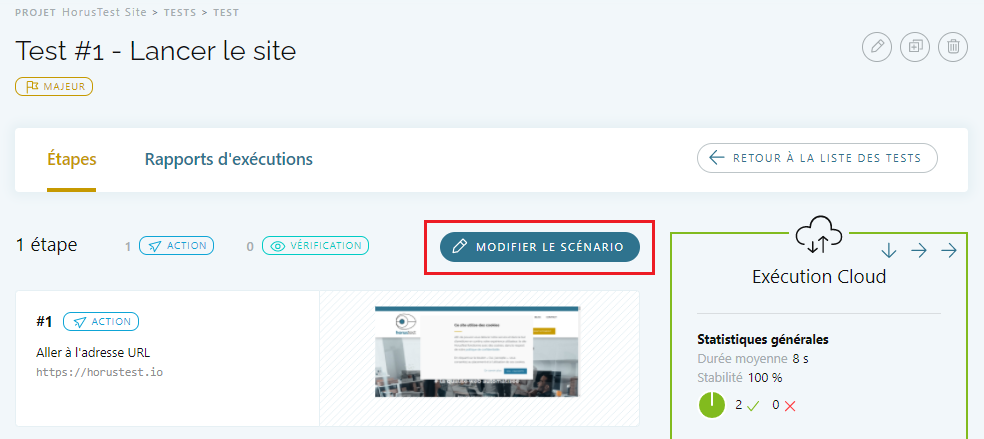 - Ou sur le bouton Modifier le Scénario si le Scénario de test ne contient déjà des Étapes de test :