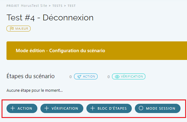 Par la suite, la composition du Scénario de test s'effectue depuis la barre d'actions du Mode Édition.