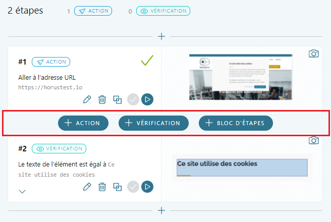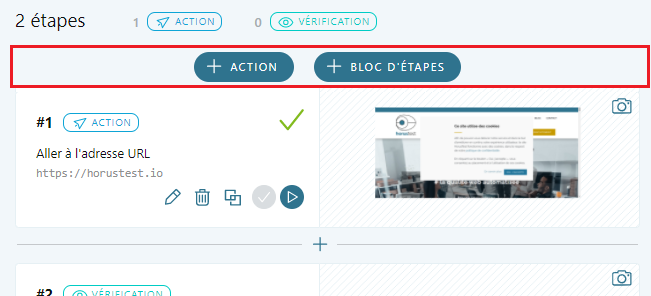 - Le Mode Étape par étape : configuration des étapes une par une (de type Action ou Vérification)