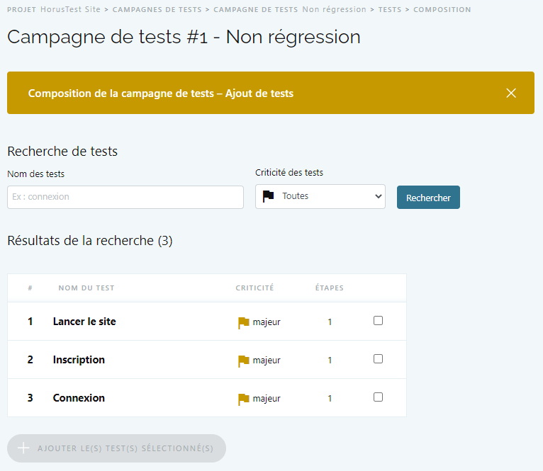 - Cliquer sur le bouton Ajouter le(s) Test(s) sélectionné(s) pour finaliser l'opération