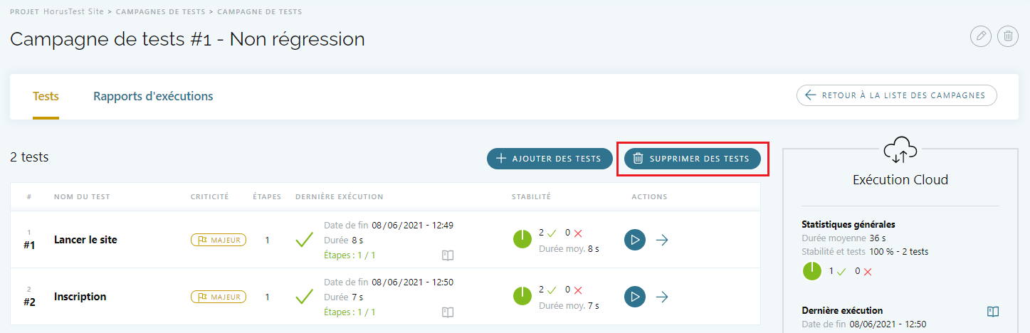Le fait de supprimer un Test d'une Campagne de tests ne supprime ni le Test, ni les Rapports des exécutions du Test réalisées au sein d'exécutions Cloud de la Campagne de tests.