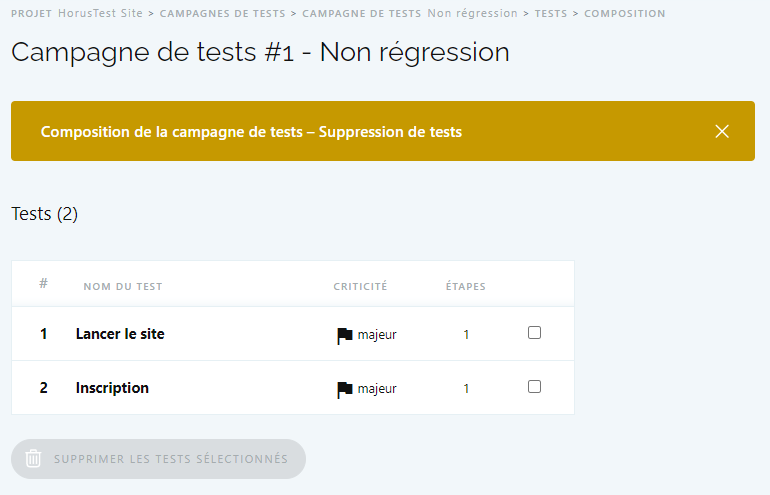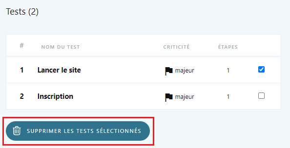 - Cliquer sur le bouton Supprimer le(s) Test(s) sélectionné(s) pour finaliser l'opération