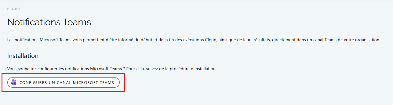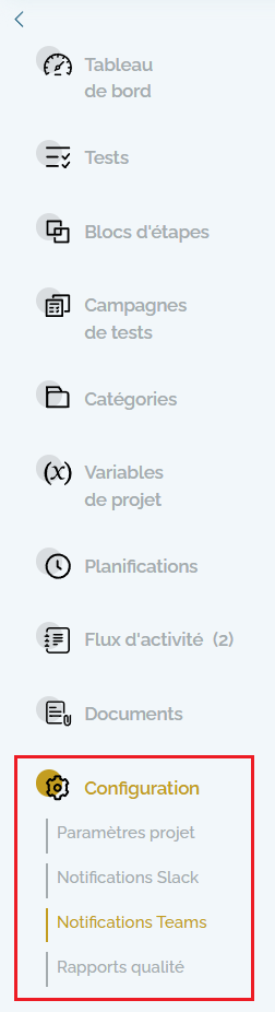 - Cliquer sur la rubrique Configuration puis Notifications Teams du Menu Projet dans le panneau latéral