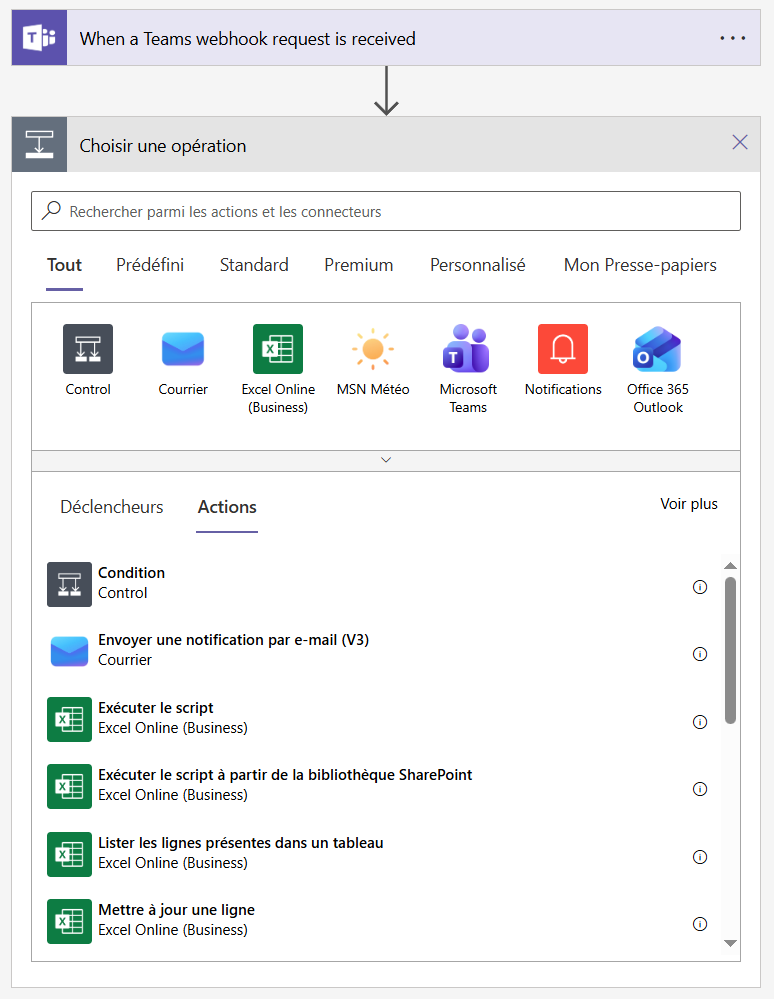 - Saisir le mot webhook dans le champ de recherche parmi les connecteurs et les déclencheurs puis sélectionner le déclencheur Lors de la réception d'une requête du webhook Teams