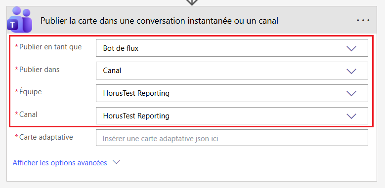 - Le formulaire de configuration de l'étape Publier la carte dans une conversation instantanée ou un canal apparaît :