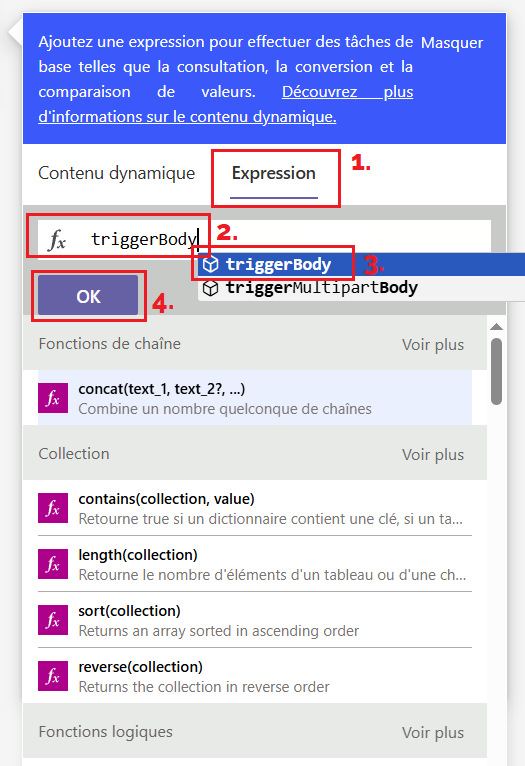 - Basculer sur l'onglet Expression puis saisissez l'expression triggerBody puis cliquer sur l'expression triggerBody qui apparaît dans la liste des propositions puis cliquer sur le bouton Ok