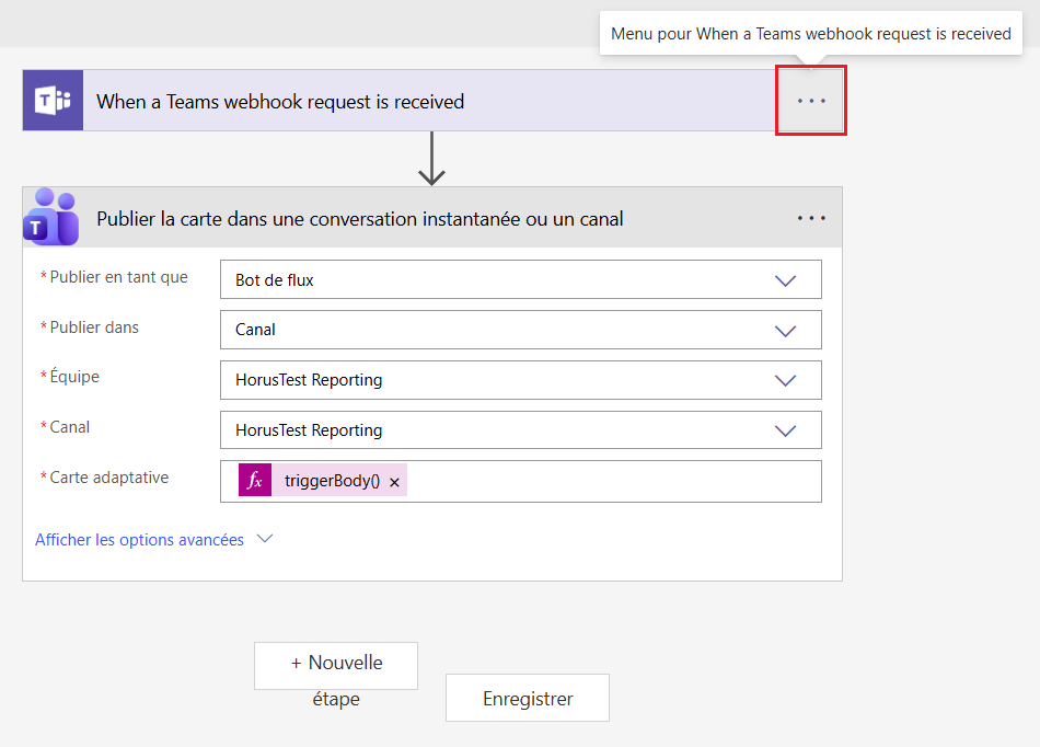 - Cliquer sur le bouton Menu pour When a Teams webhook request is received