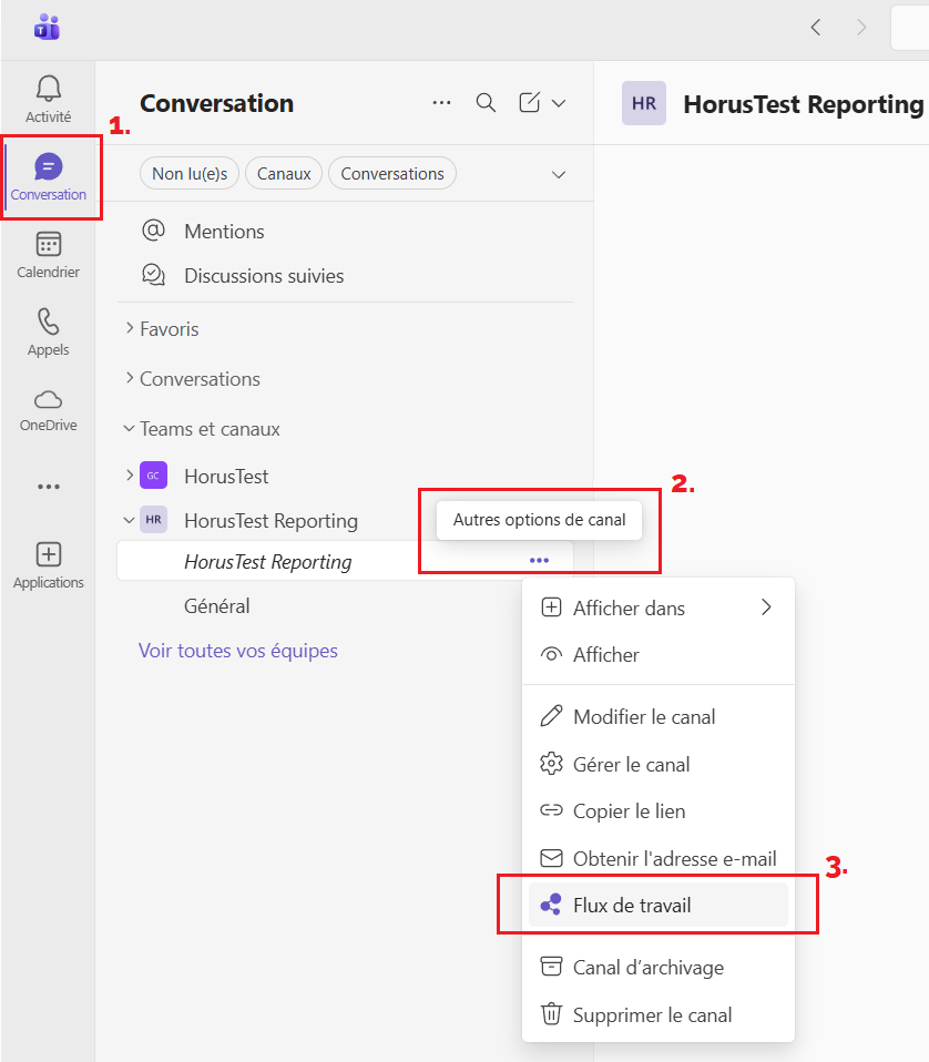 - Dans la rubrique Conversation , cliquer sur le bouton permettant d'afficher les autres options du canal pour recevoir les notifications puis cliquer sur l'option Flux de travail