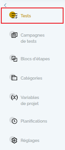 - Cliquer sur la rubrique Tests du Menu Projet dans le panneau latéral :