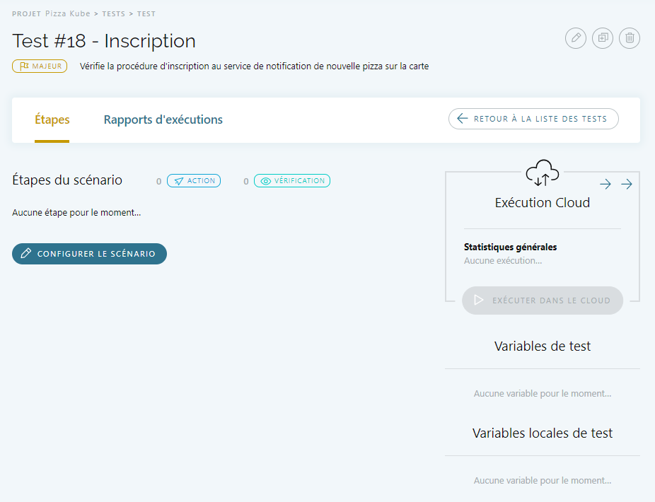 Cependant, il ne s'agit, à ce stade, que d'une coquille vide (le Test ne contient pas encore d'Étapes de test) :