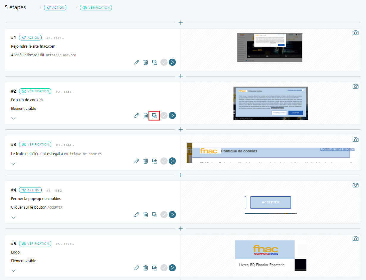 Exemple avec le Scénario de test suivant qui affiche un site et ferme la pop-up de Cookies :