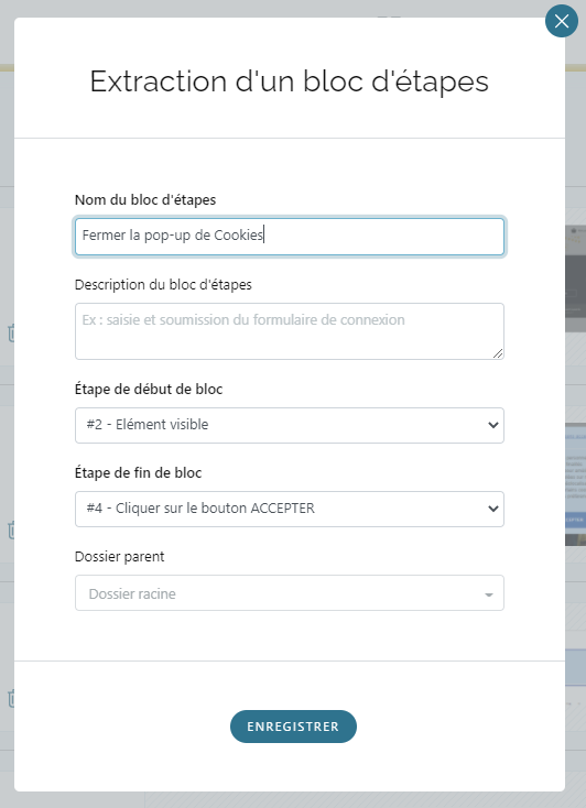 - Le formulaire d'Extraction d'un bloc d'étapes apparaît :