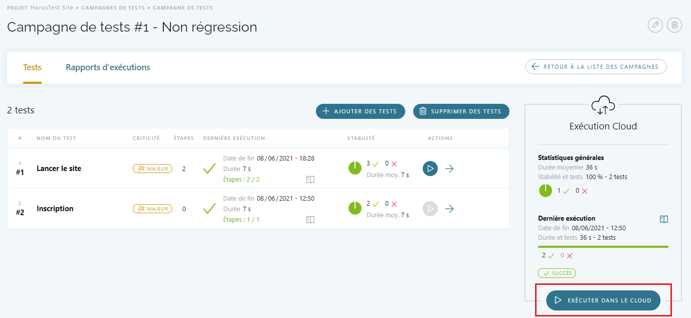 - Depuis la liste des Campagnes de tests